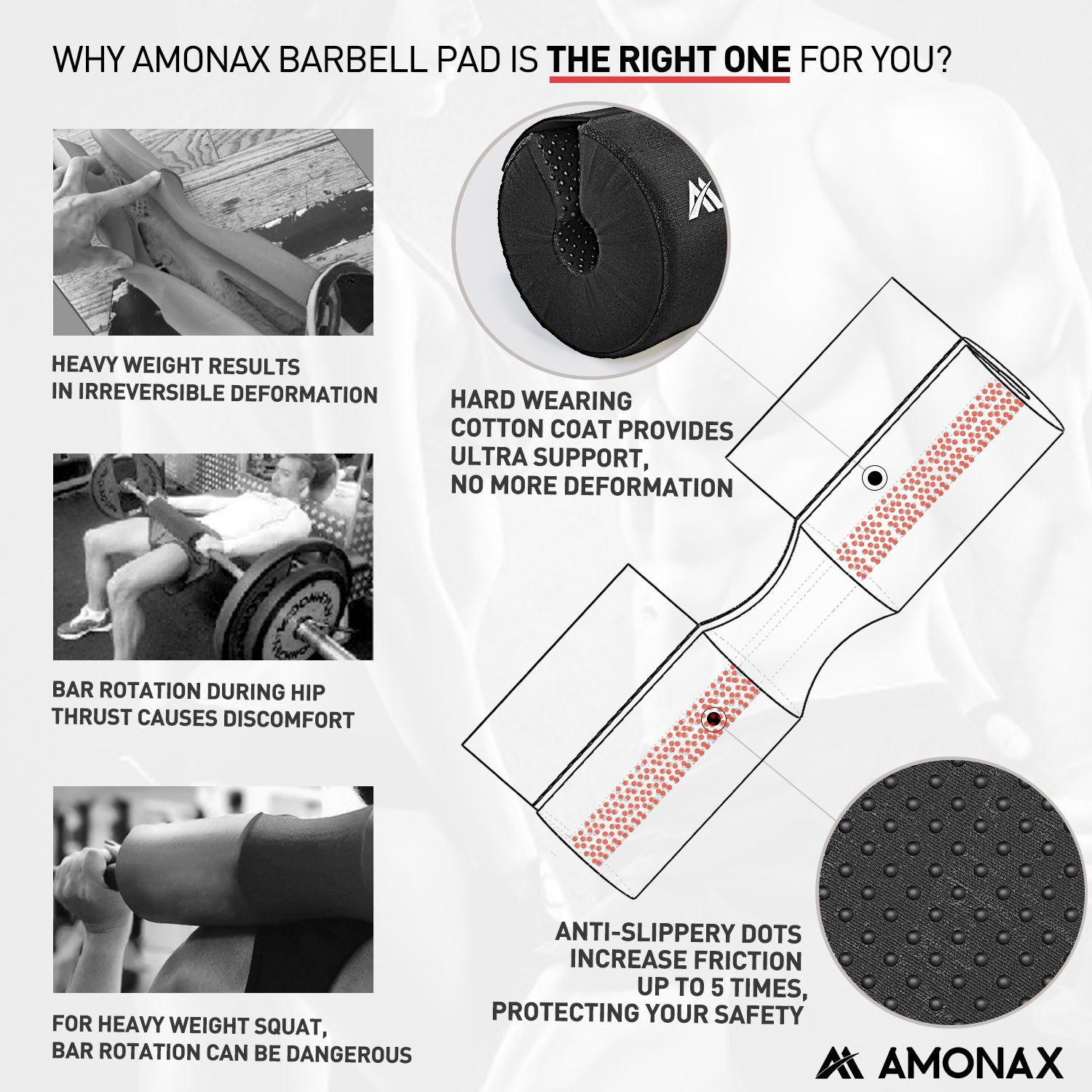 Amonax squat shoulder pad fits any Standard or Olympic bars. There¡¯s no danger of this bar pad slipping, sliding, or falling off, which can be a problem with some other safety squat bar bell pad.