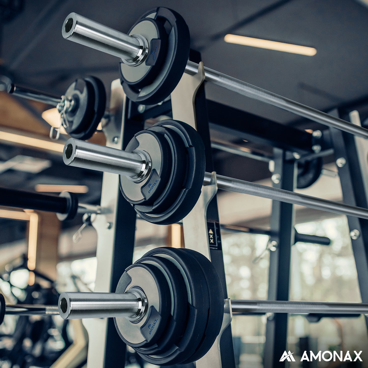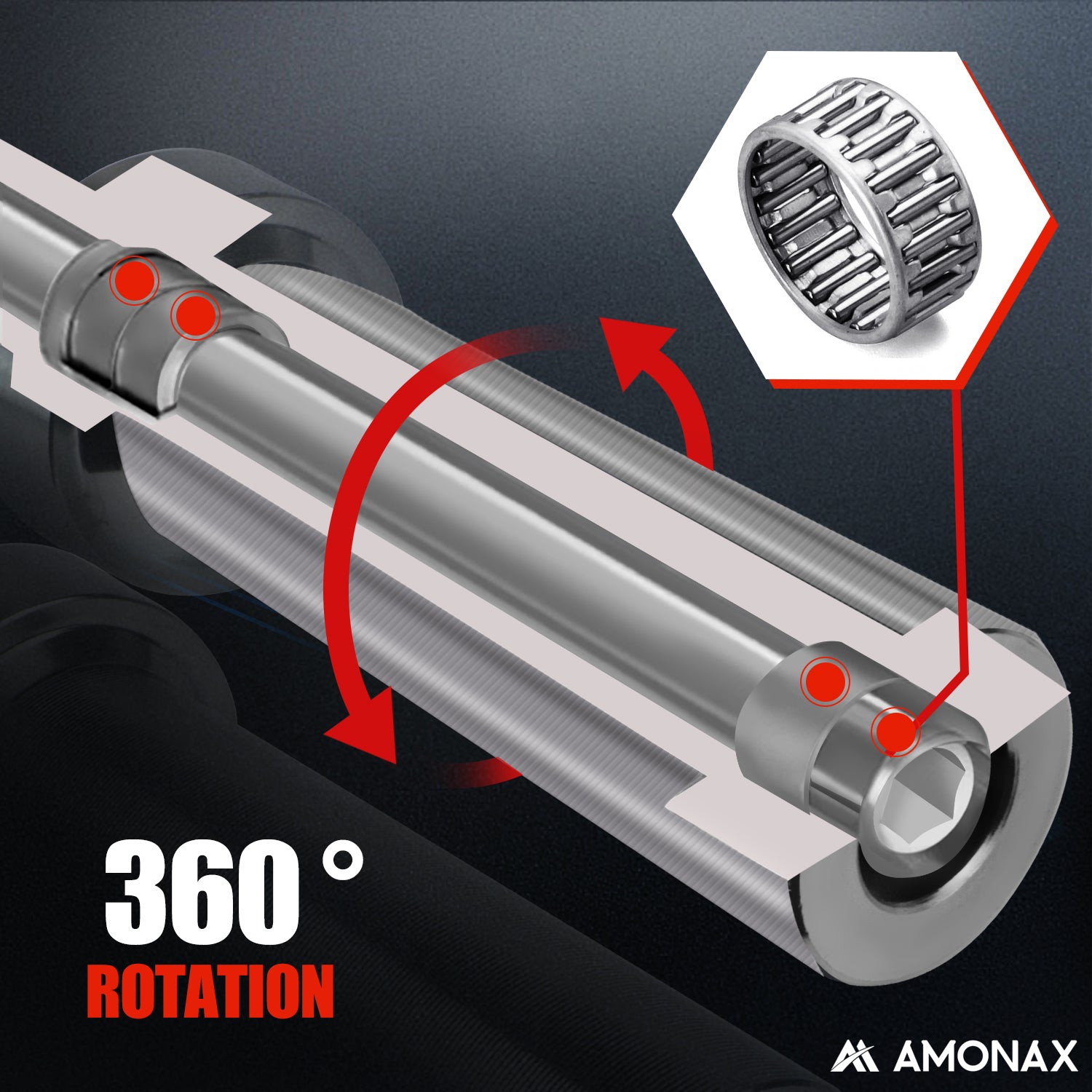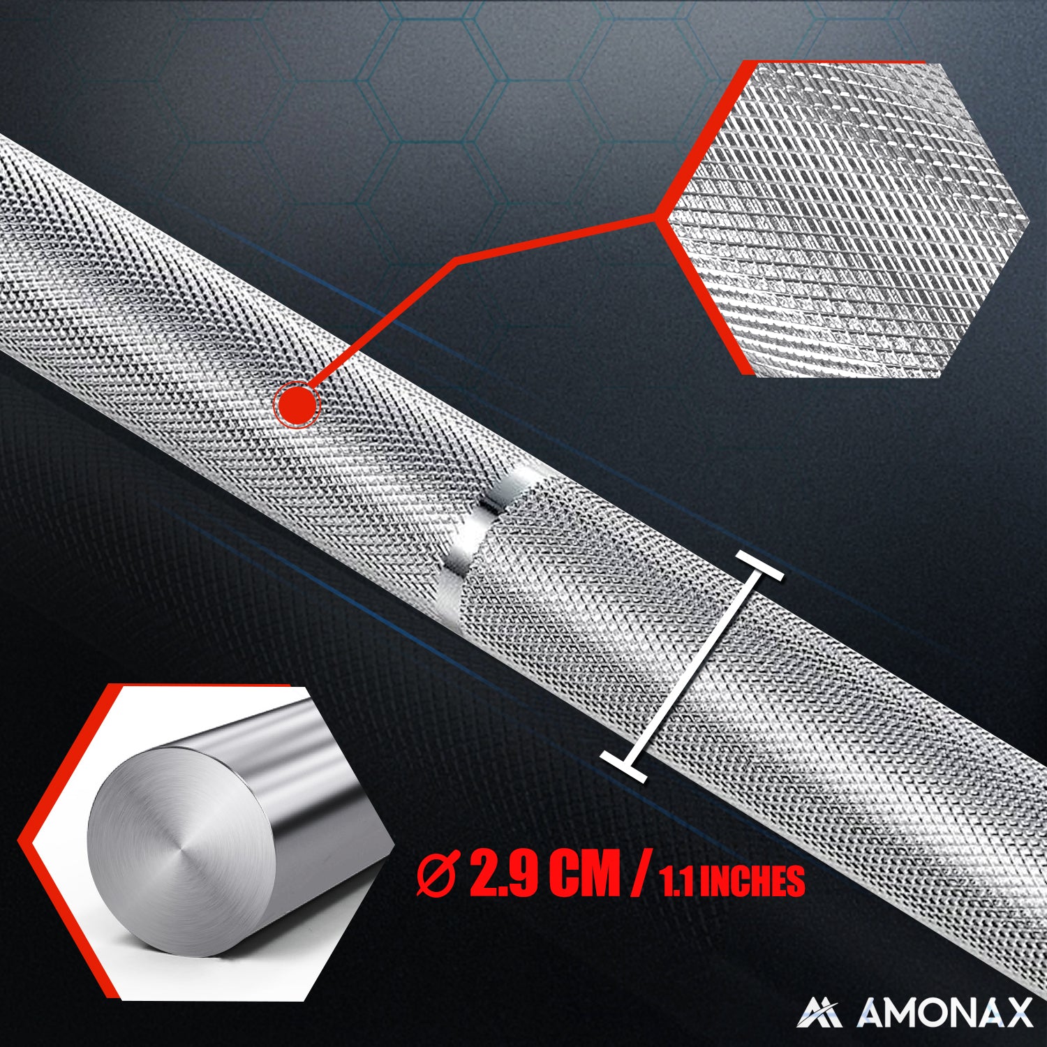 The Hill Knurls of Amonax 7 ft Olympic bar are milder when compared to the pointy Mountain knurls. This is to prevent the heavy weights rip your hands apart when the bar spins in your hand (this bar can carry more weights than 4 ft Olympic bar), and prevent scraping injury during traditional lifting workouts. Amonax 7 ft bar is also featured with a central knurling which "grabs" you to help prevent the bar from sliding down from your back during squat. It is a great bar to be included in any barbell set for women and men.